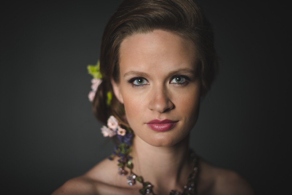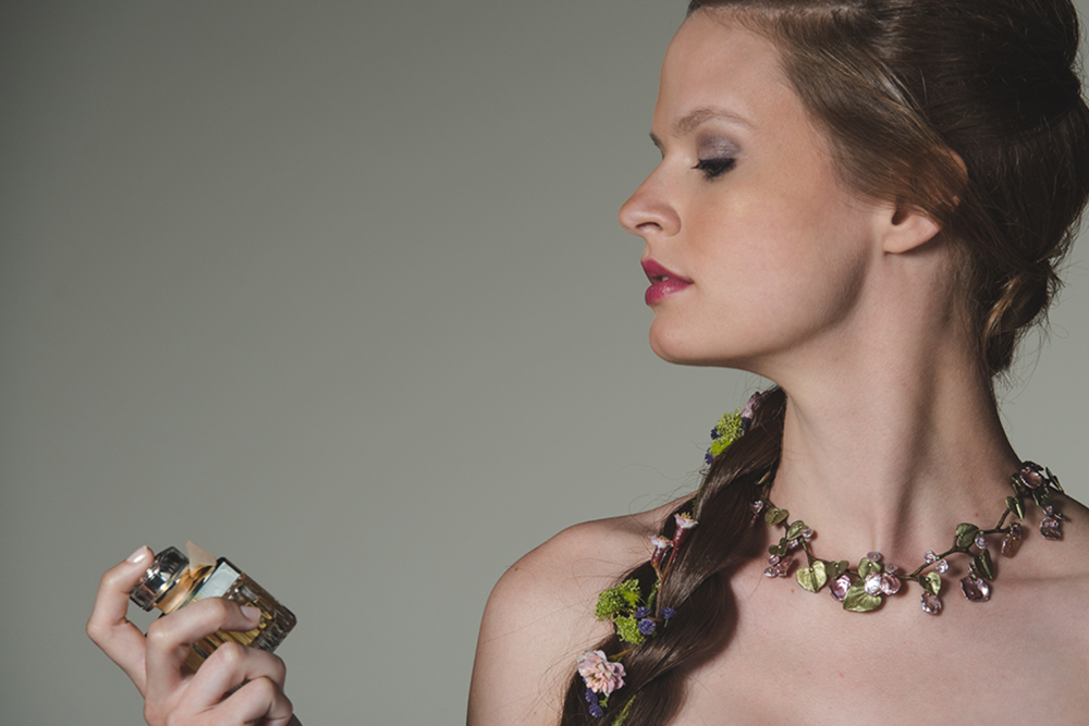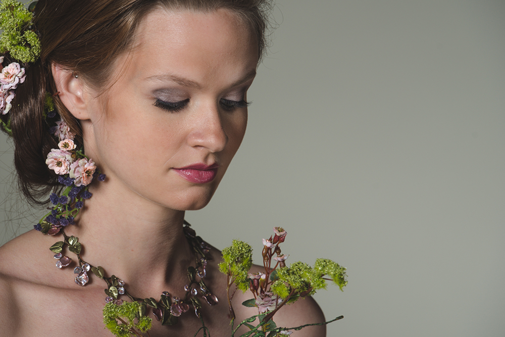 This is part of a series depicting each of the five senses. This one is smell. This look centrally focused around flowers and we wanted the images to convey a sense of smell. A soft blush, with eye shadow and lips that played off of the floral notes, helped us pull off this look.